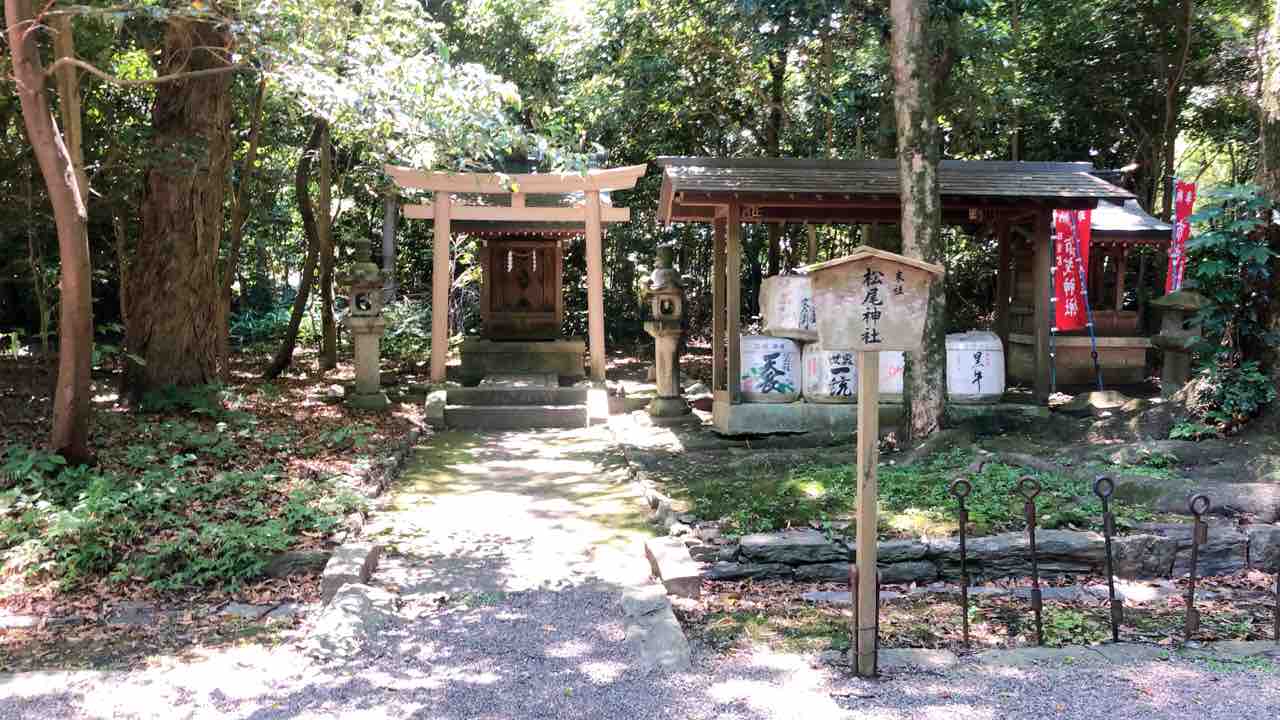 境内には様々な末社が祀られていました。こちらは松尾大社です。大山作神と市杵島姫命が祀られていて、醸造の神様として知られています。付近には酒樽が置かれていました。