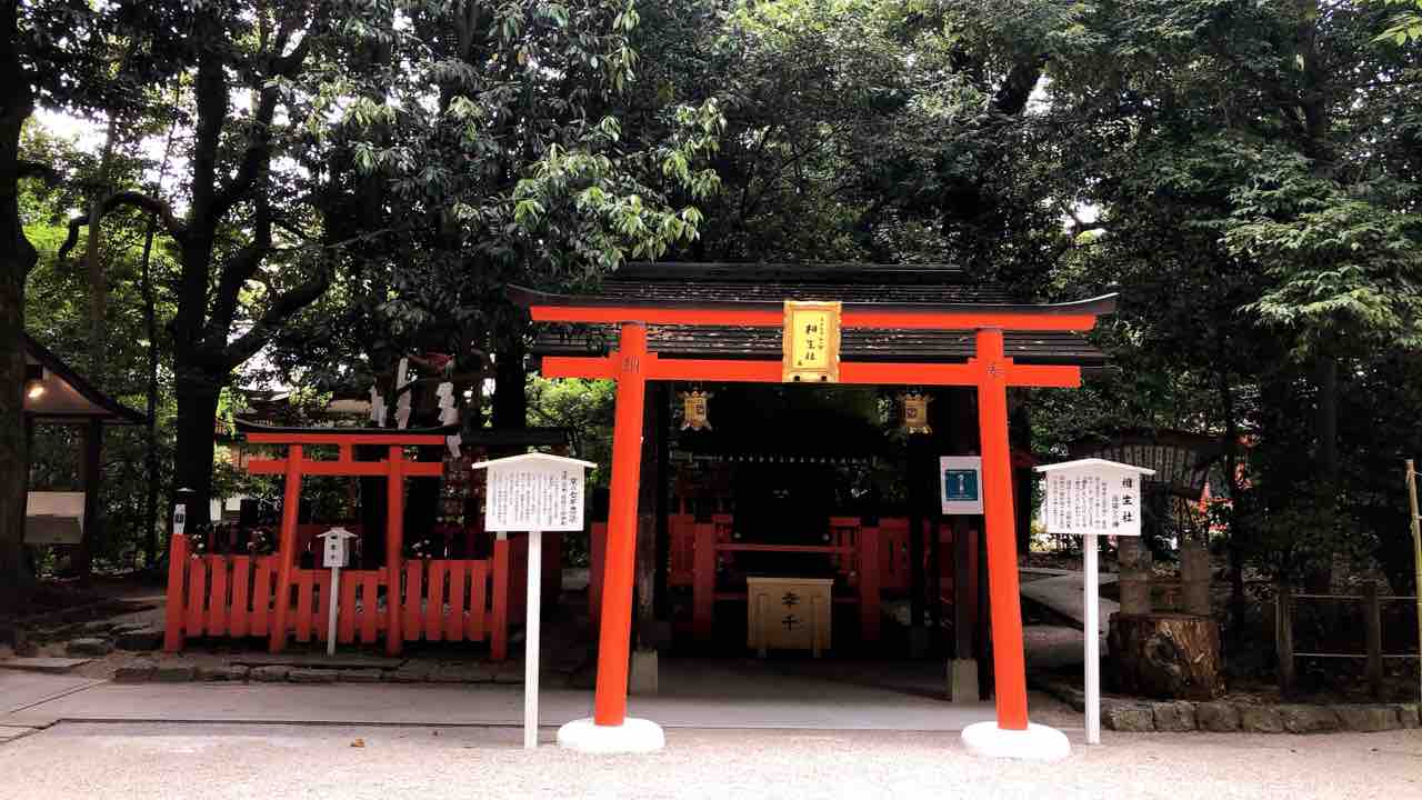 この楼門の手前には『相生社』と呼ばれる縁結びの社があります。相生社の傍らには2本の木が途中からつながって1本の木となっている『連理の賢木』という不思議な木が植わっています。相生社と連理の賢木の周囲を作法に従って回り、縁結びを祈願するとご利益があると言われているそうです。