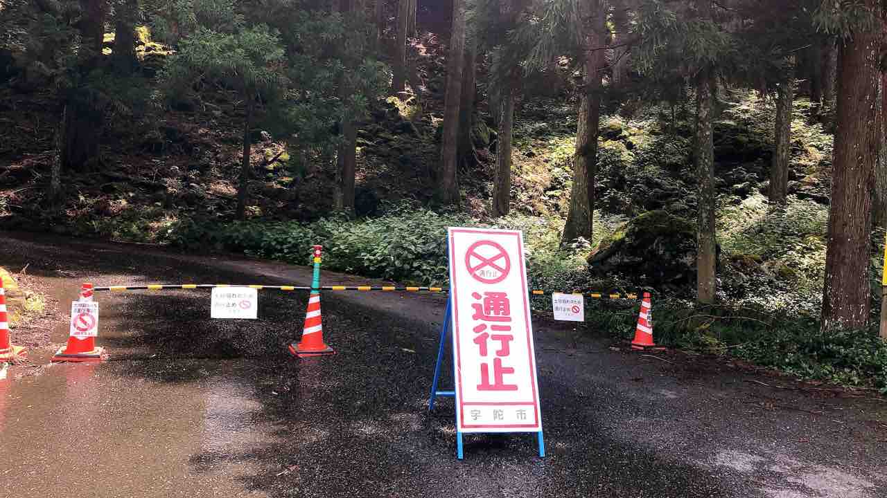 龍穴神社を参拝した後、その先の山道を登って天岩戸と吉祥龍穴を訪れる予定でした。前日大雨が降ったのでもしかしたら…と思っていたらやっぱり土砂崩れが起きていて通行止めになっていました。