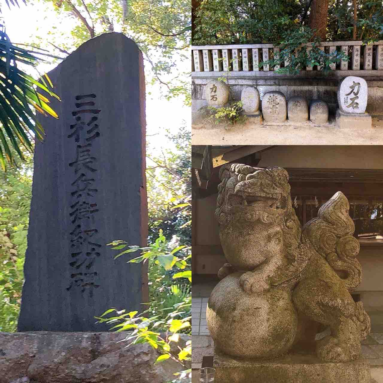 力比べに利用されたと言われている力石と、狛犬、三杉長兵衛の石碑
