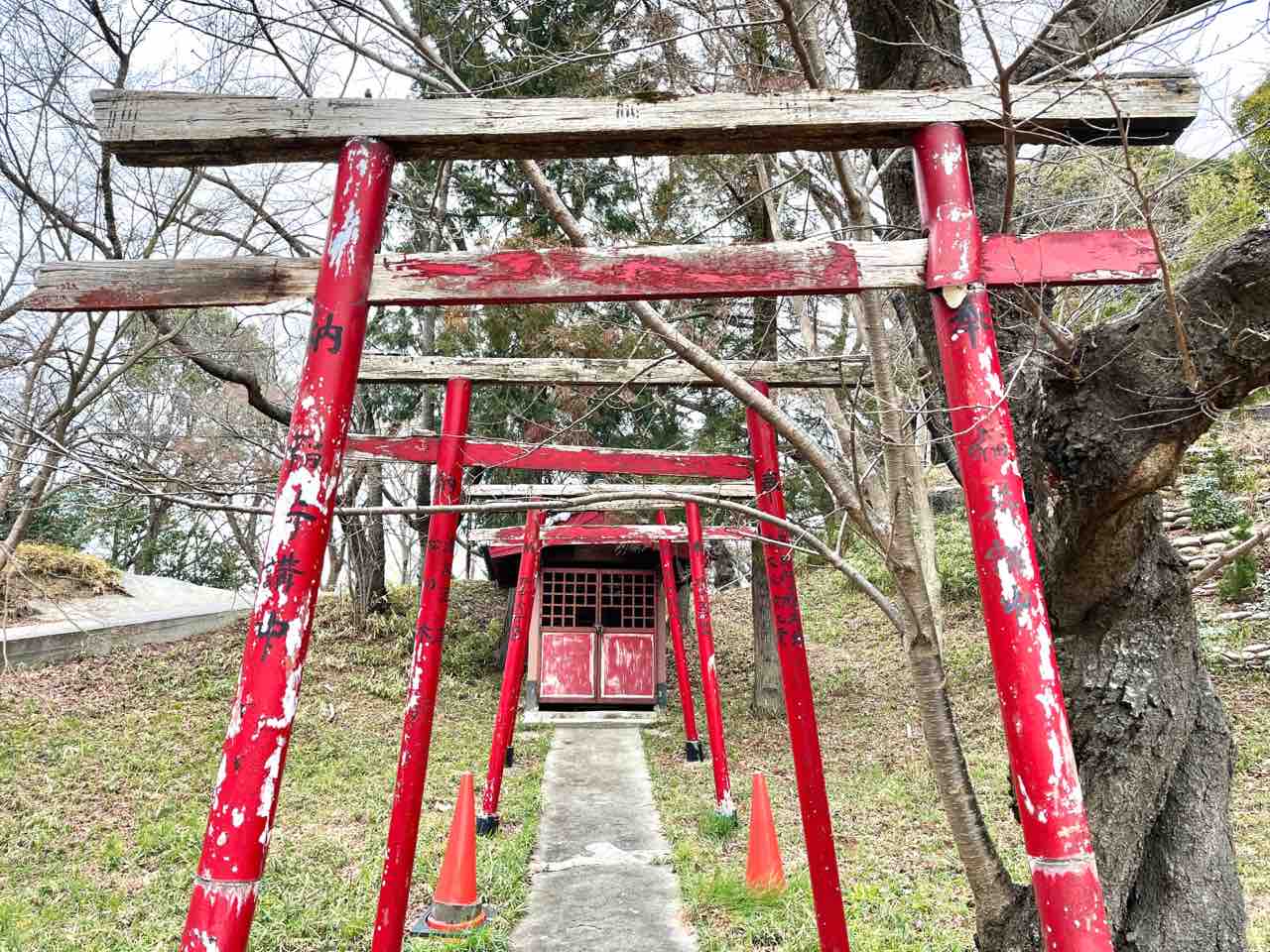 墳丘の下に摂社の稲荷社がありました。鳥居はかなり古いものであることが伺えます。