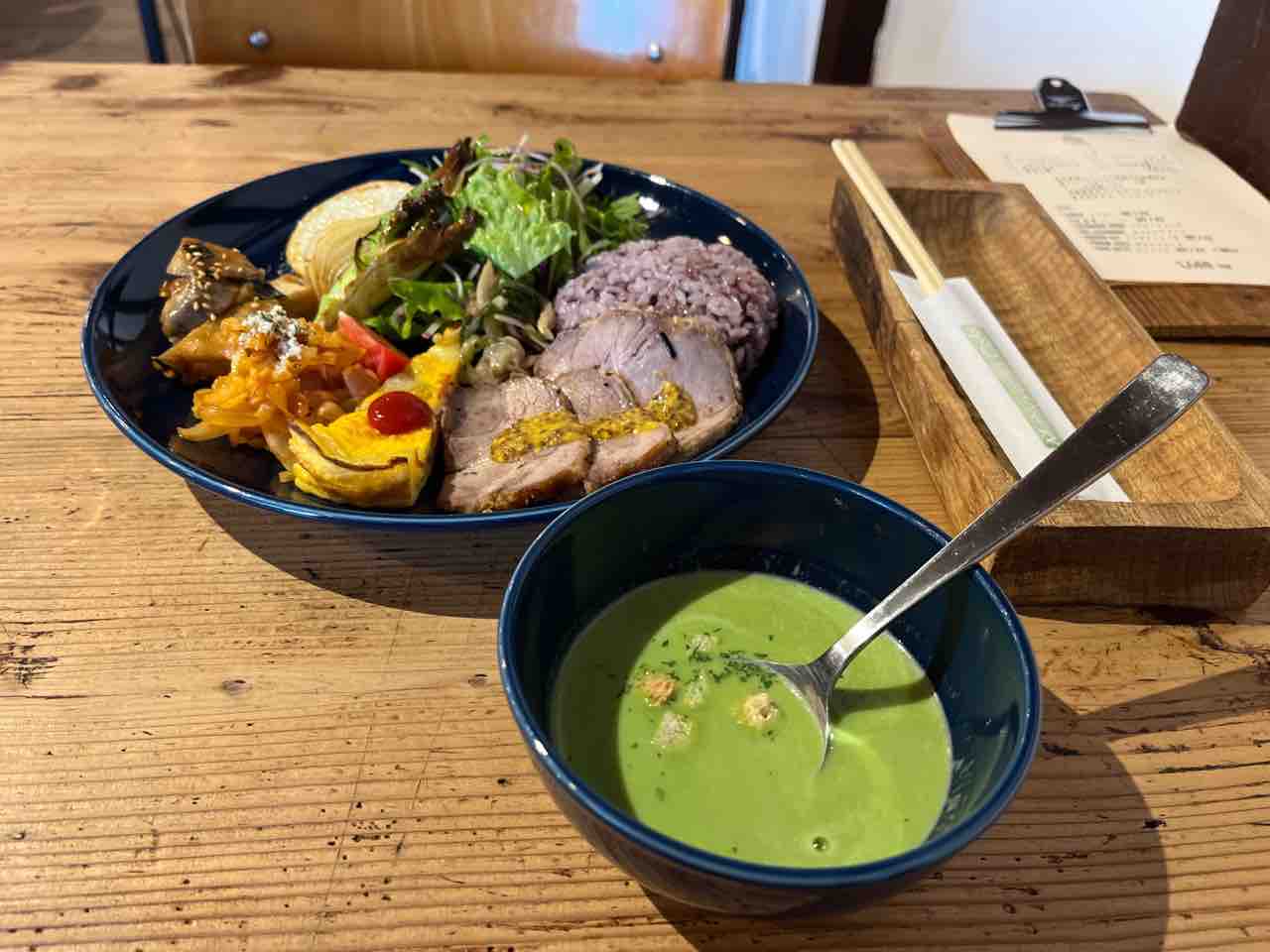 菜の花のポタージュがすごく美味しくて。家でも作ってみたくなりました。1プレートで様々な野菜が食べられるのが嬉しいです。ローストされた新玉葱が本当に美味しかったです。全部美味しかったですね。
