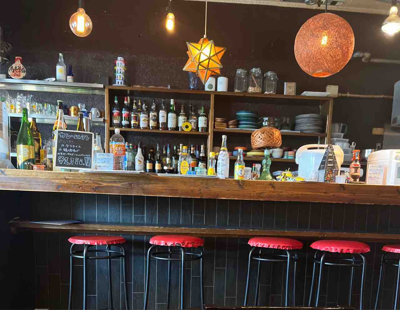 お店は18時からバー営業をされているようでお酒の瓶がたくさん並べられていました。ランタンのような照明もおしゃれです。