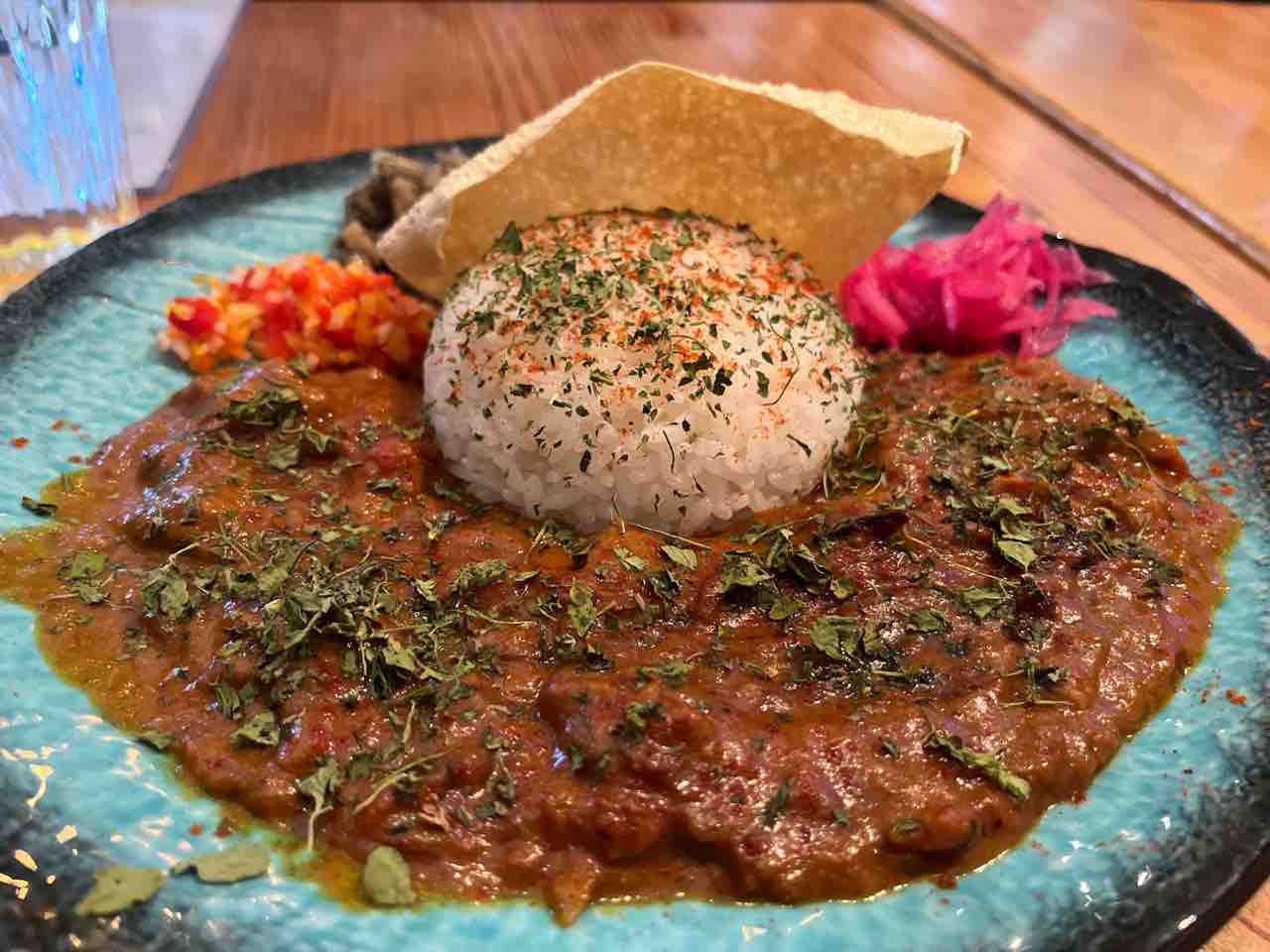 辛さを選べたので中辛にしました。中辛でもけっこう辛くて汗を流しながら食べていました。カレーの上に振りかけられているのはパクチーではありませんので、パクチーが苦手な方はご安心を。