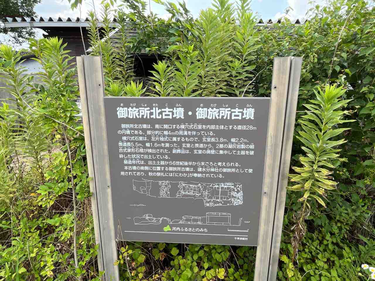 案内書きによると御旅所北古墳は6世紀末頃の古墳で、直径28mの円墳だそうです。屋根の下には横穴式石室が残されていました。