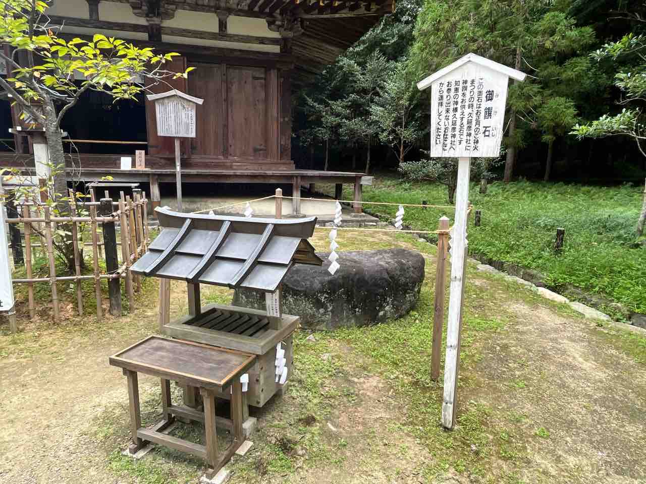 本殿前に置かれている御饌石(みけいし)。正月の神火祭の時に久延彦神社に神饌をお供えするための石のようです。