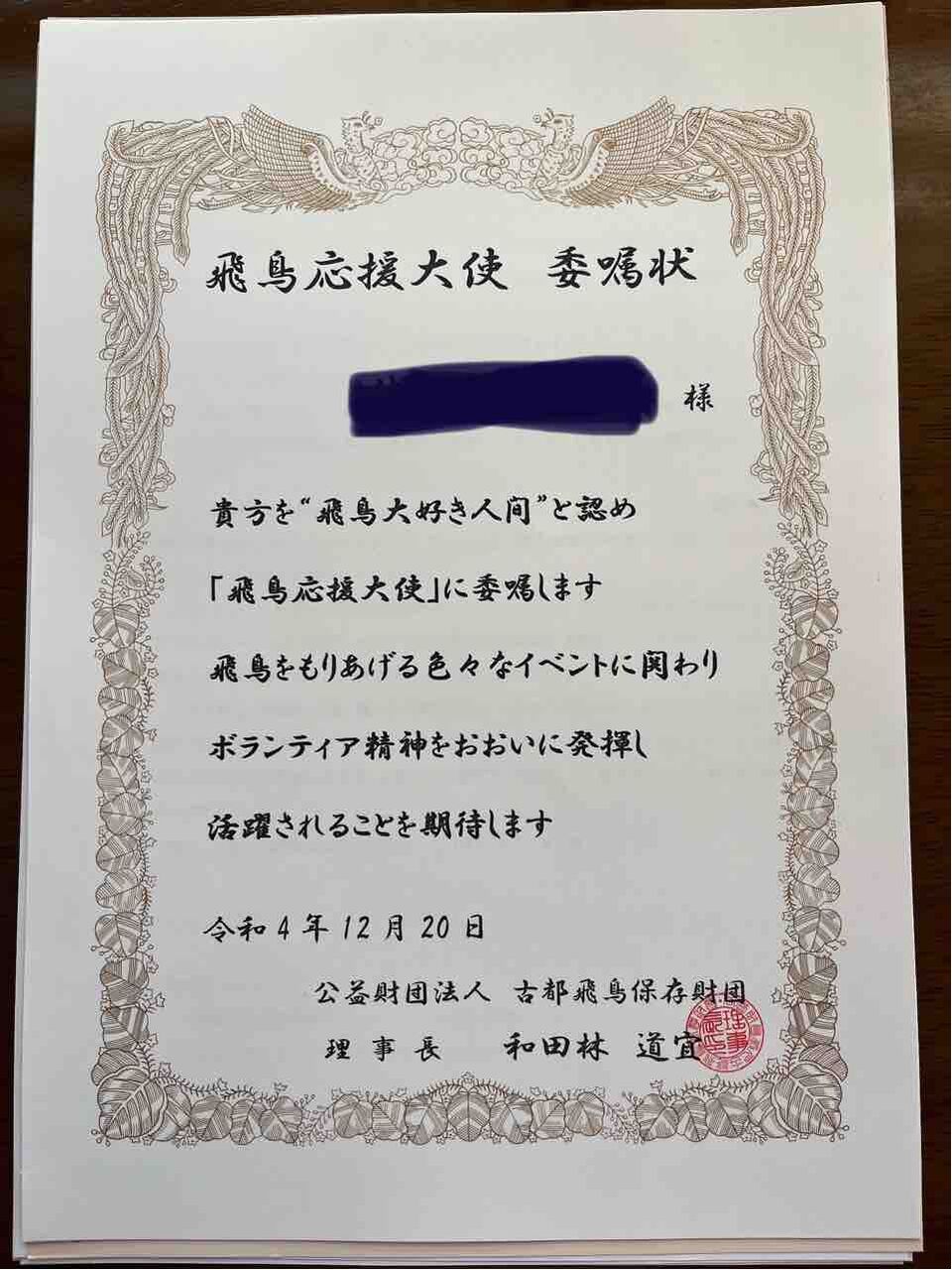 この度2022年12月20付で『飛鳥応援大使』に就任いたしました。