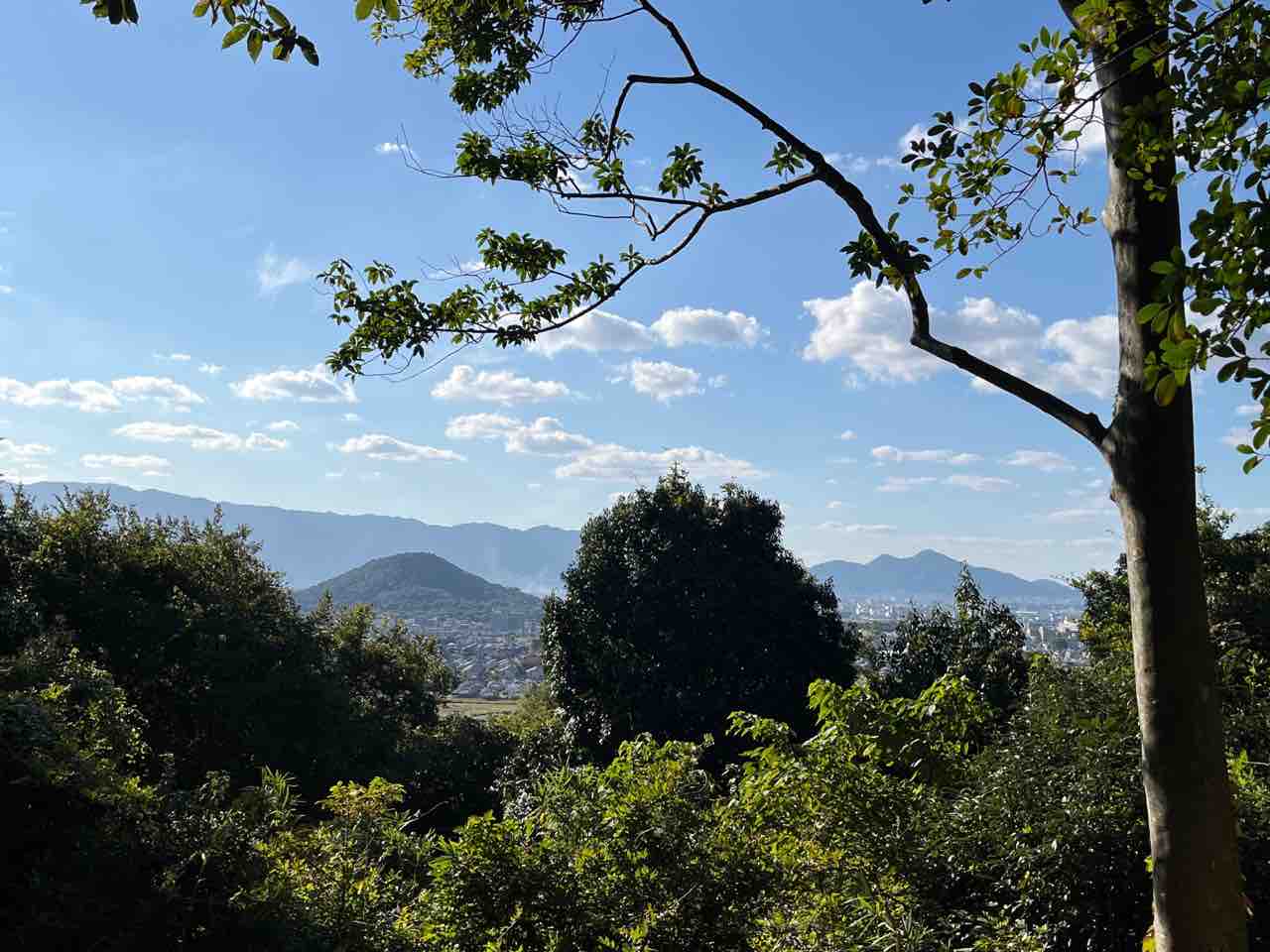 山頂からは畝傍山、橿原神宮、二上山、大和盆地などが一望できました。机と椅子が置かれているのでここで一休みもできます。