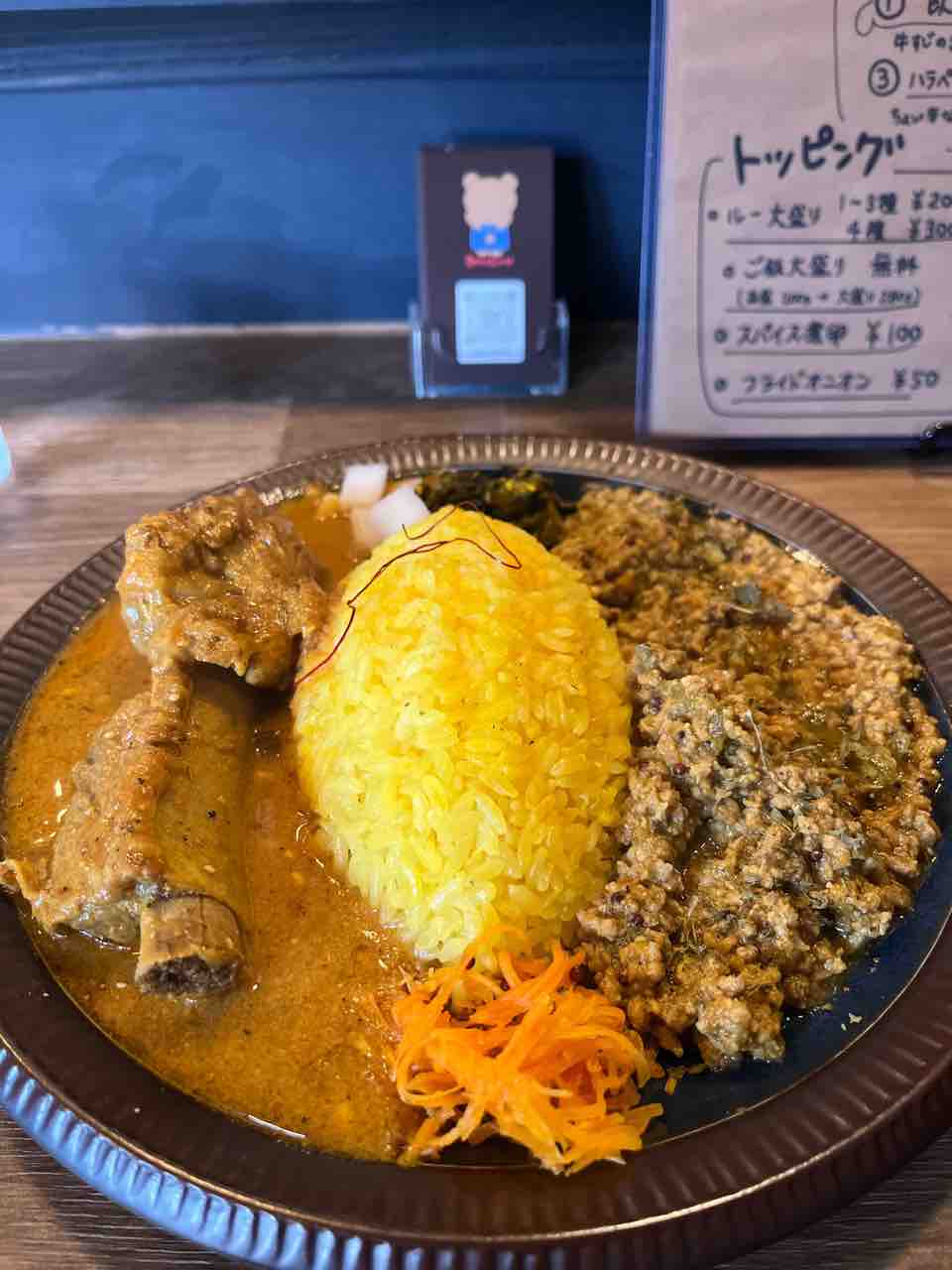 1種盛りから4種盛りまで選べてトッピングもお好みでカスタマイズできます。私はキーマカレーとスペアリブカレーの2種盛りをオーダーしました。メニュー表に辛さが書かれているのがありがたいです。