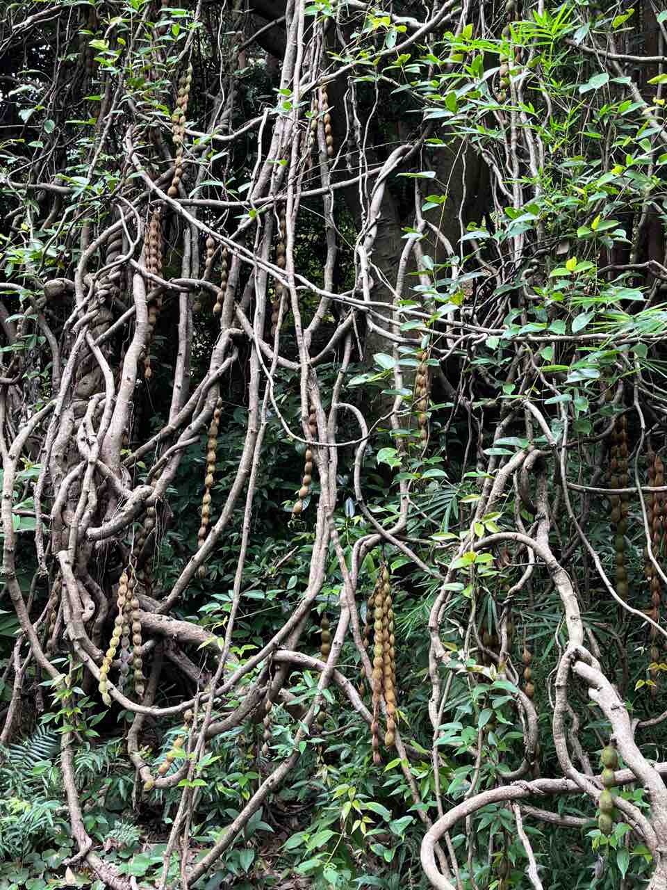 温室でありませんが本館から南園へと続く道の途中に面白い植物が生えていました。カズラ科の植物のようですが、でかくて長細い豆みたいでした。