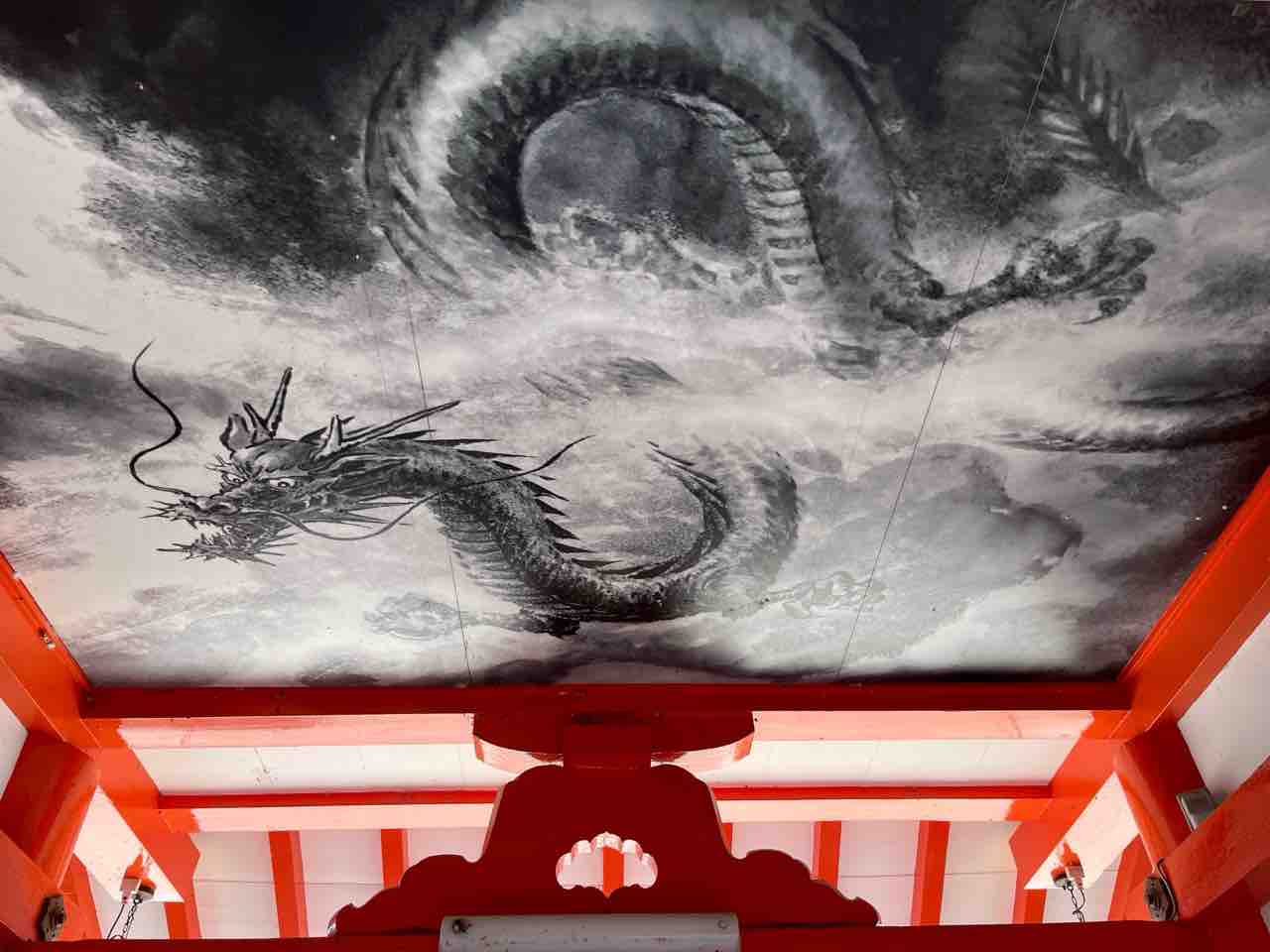 本殿は春日大社の旧社殿に使用されていた木材を拝領し建立されたそうです。拝殿脇に摂社(恵比須社、菅原社、市岐島社、天神社、金比羅社、愛宕社、稲荷社、八幡社)が祀られており、本殿の天井には迫力のある龍の絵が描かれていました。