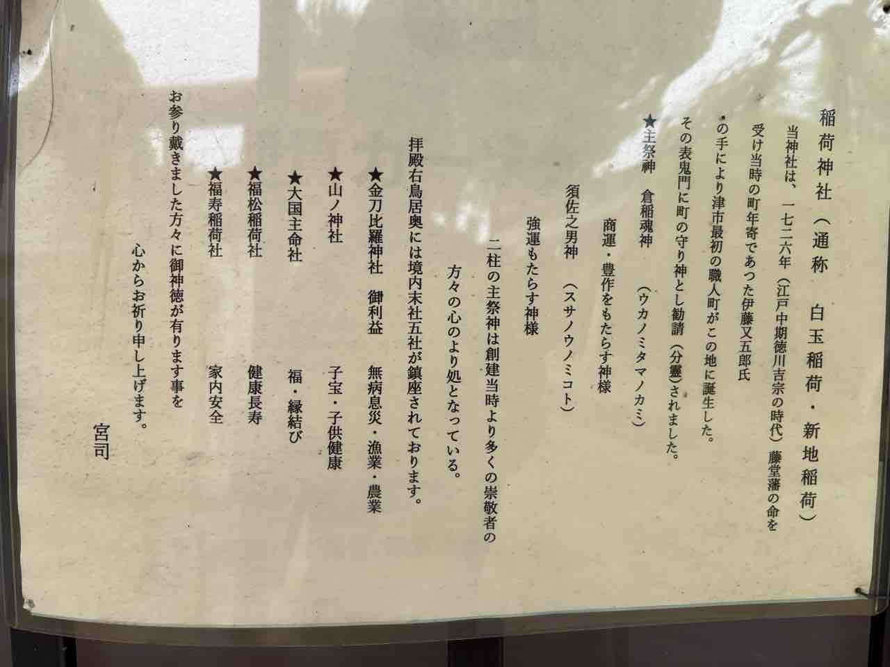 由緒書きによると1726年に藤堂藩の命を受けた当時の町年寄・伊藤又五郎氏が津市最初の職人町を形成したとのことで、その表鬼門に町の守り神として勧請されたのがこの稲荷神社だそうです。