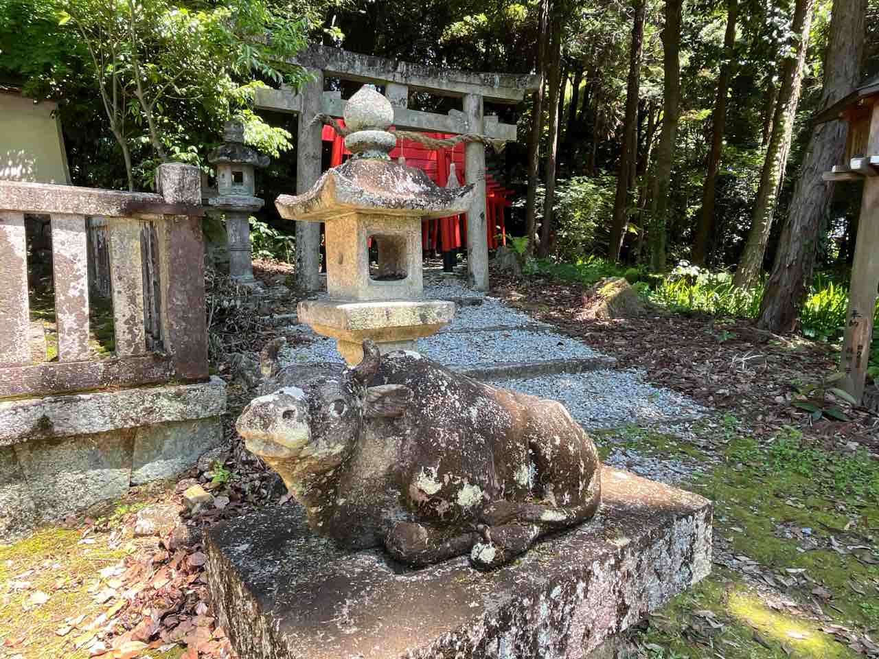 伊射奈岐神社は中世には天神社と称され、江戸時代には柳本藩の藩社になったとのことです。その名残なのか境内には天満宮と刻まれた灯篭や牛の像がありました。