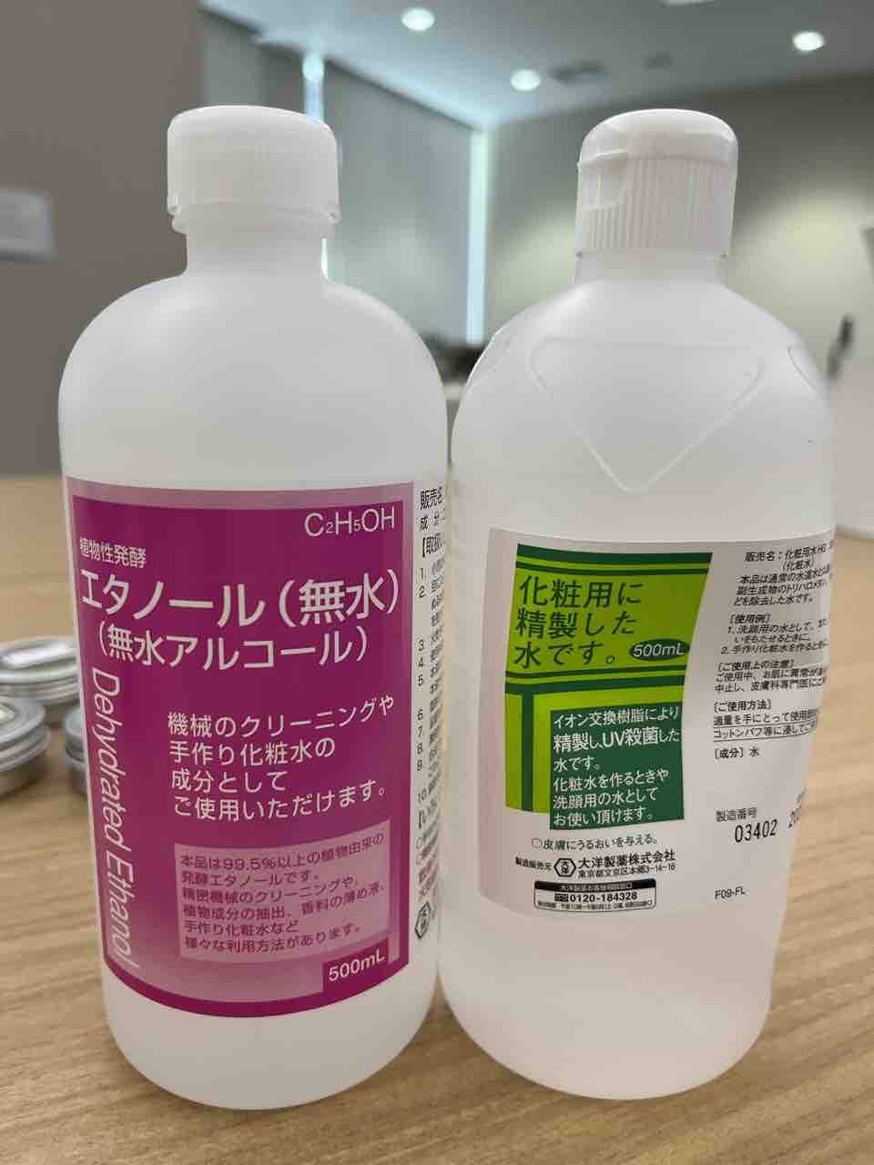 無水エタノールと精製水は薬局で購入できるらしいので、今度自宅で作ってみようと思います。
