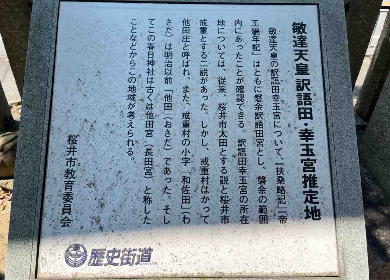 訳田幸玉宮跡は桜井市戒重説と桜井市太田説があるようですが、のちに大津皇子の邸宅となった場所で、持統天皇から宣告を受け自害したのもこの地と推定されるようです。