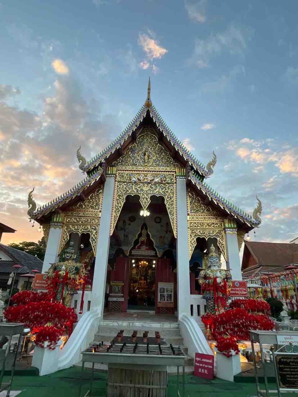 ワット サーイムーン ムアンもパマーもガイドブックには載っていなかったので有名なお寺ではないのかもしれませんが、とても煌びやかであちこちに美しい装飾が施されていて夕焼けの空によく映えていました。
