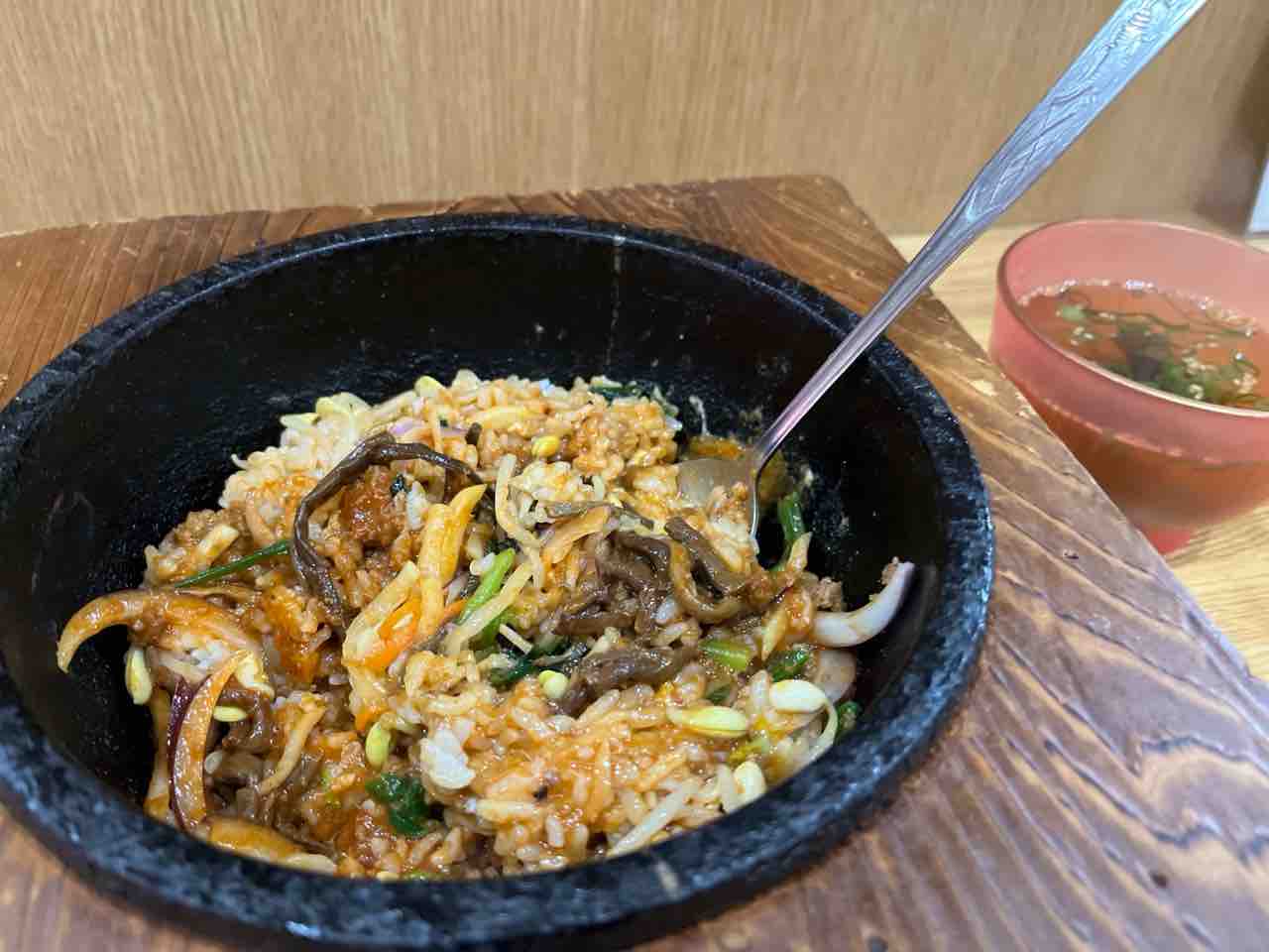お詣りの後は長居駅周辺のあじえんうどんで石焼ビビンバを食べました。ここのお店の石焼ビビンバは絶品です。うどんとセットにもできます。