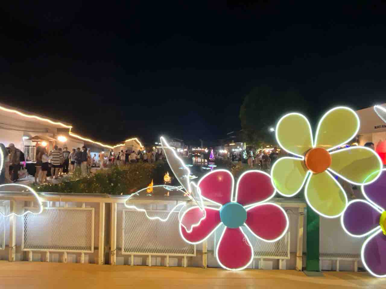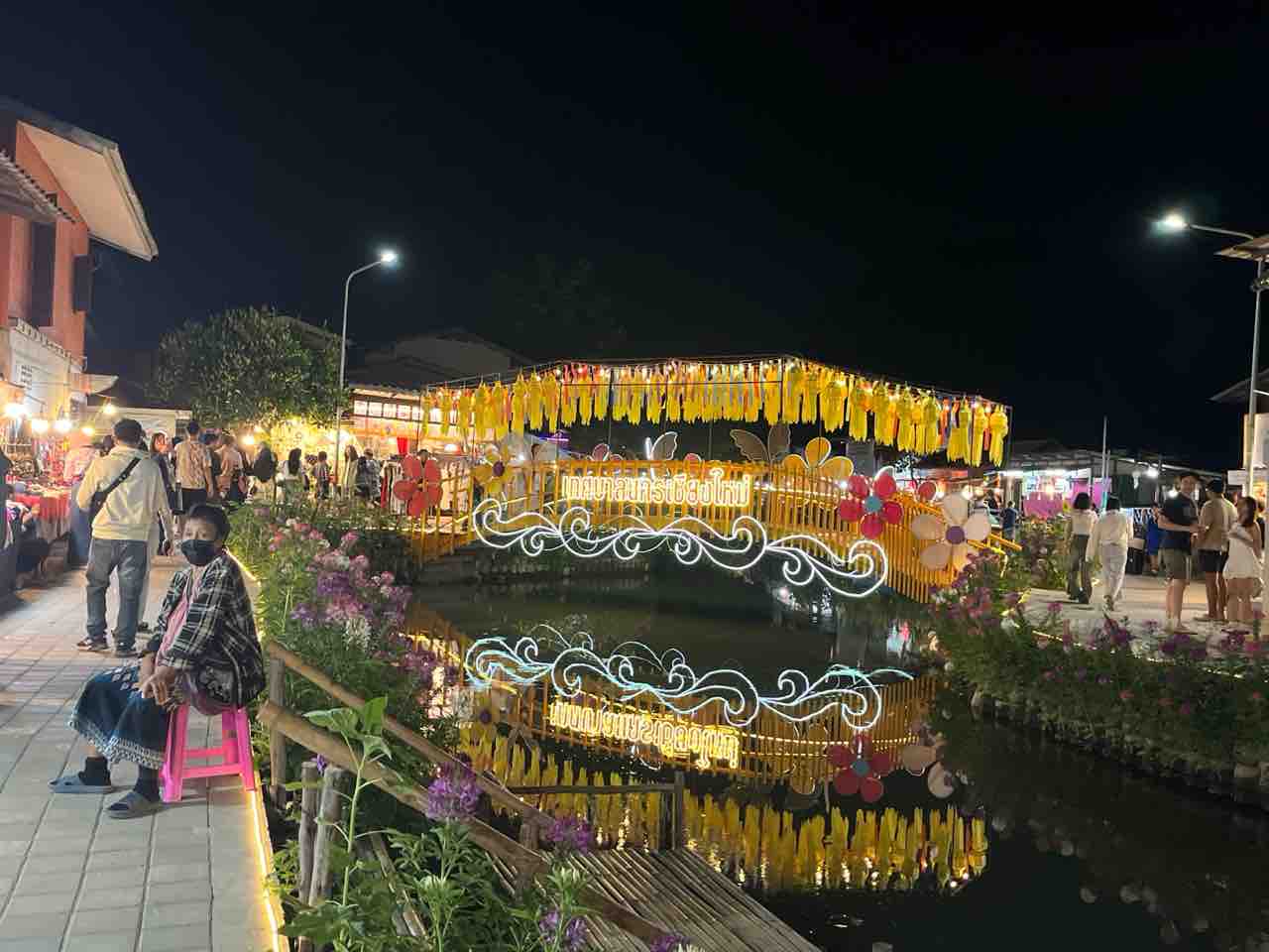 ライトアップされた橋があり写真スポットになっているようでした。橋にはベンチもありナイトマーケットを眺めながら休憩もできます。
