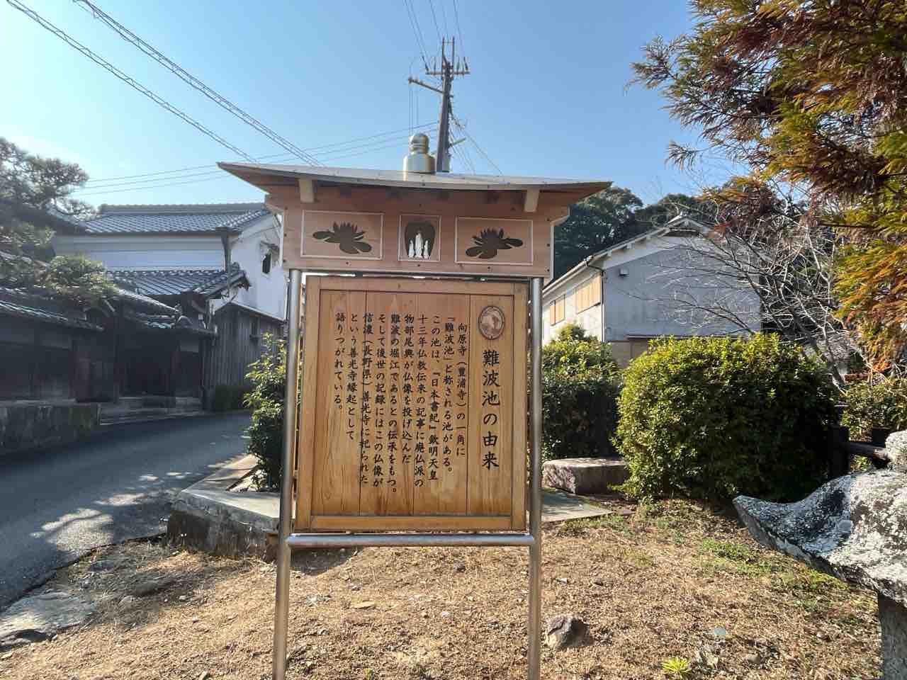 すぐ隣にある難波池には説話があり、かつて疫病が流行った際に災害は仏教崇拝によるものだと物部氏が仏像を難波池に投げ込んだと伝えられています。