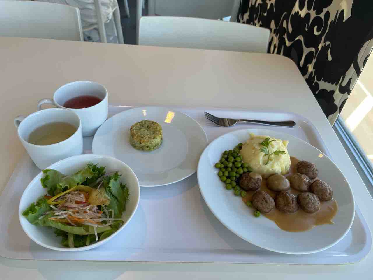 今回は海を見ながらミートボールプレートとサラダ、ブロッコリーとチーズなどが入ったスウェーデン風おやきを食べました。