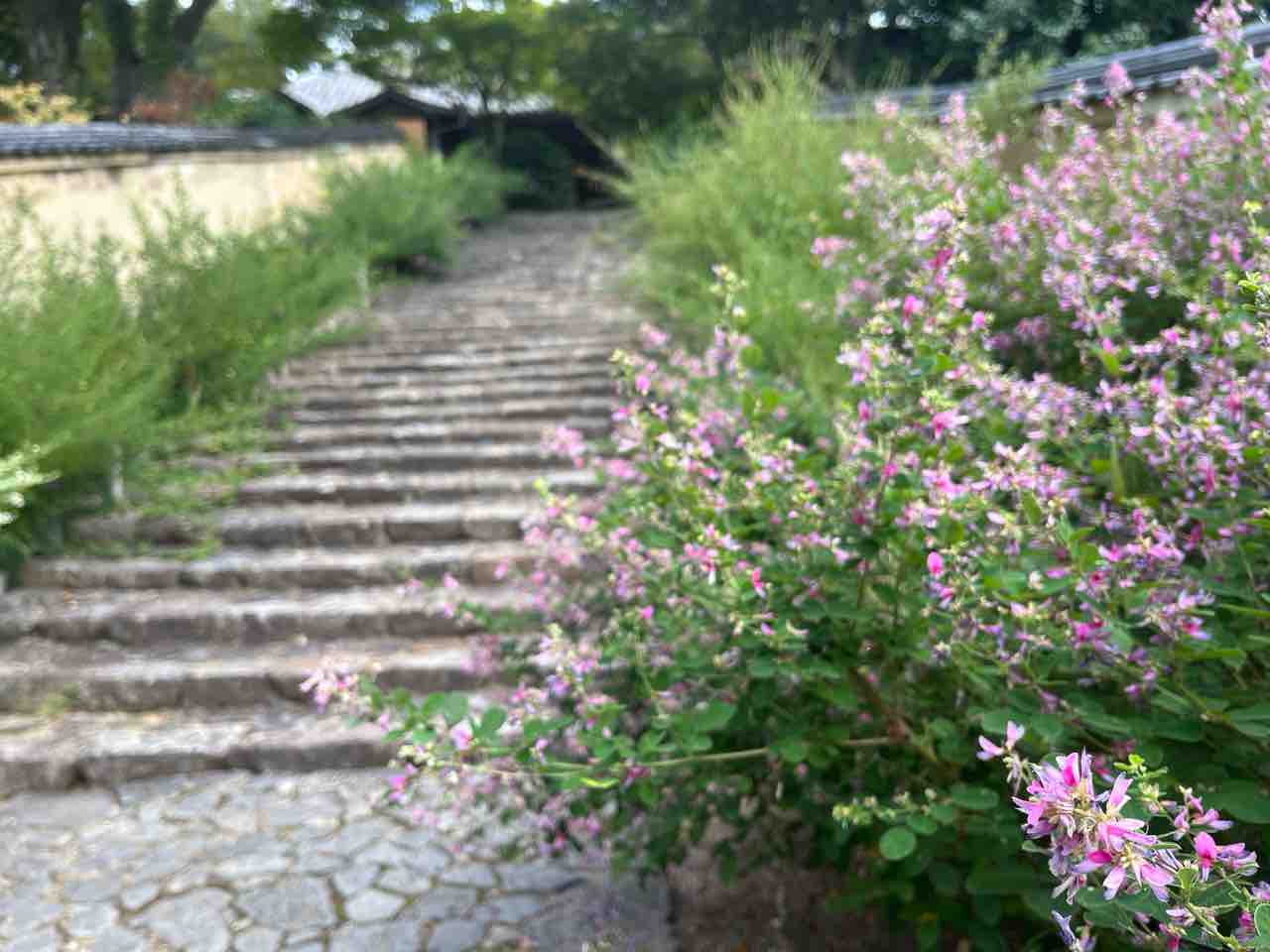秋には参道の石段を赤紫や白の萩が境内を彩ります。寒桜や紅葉も見事で、季節ごとに違う表情が見られるお寺です。