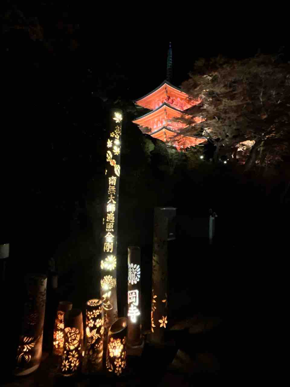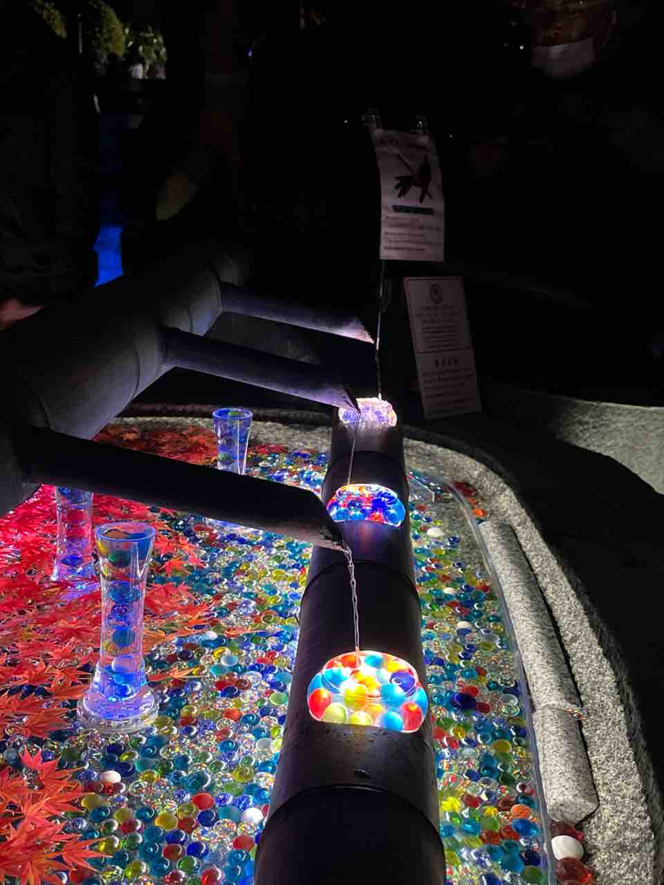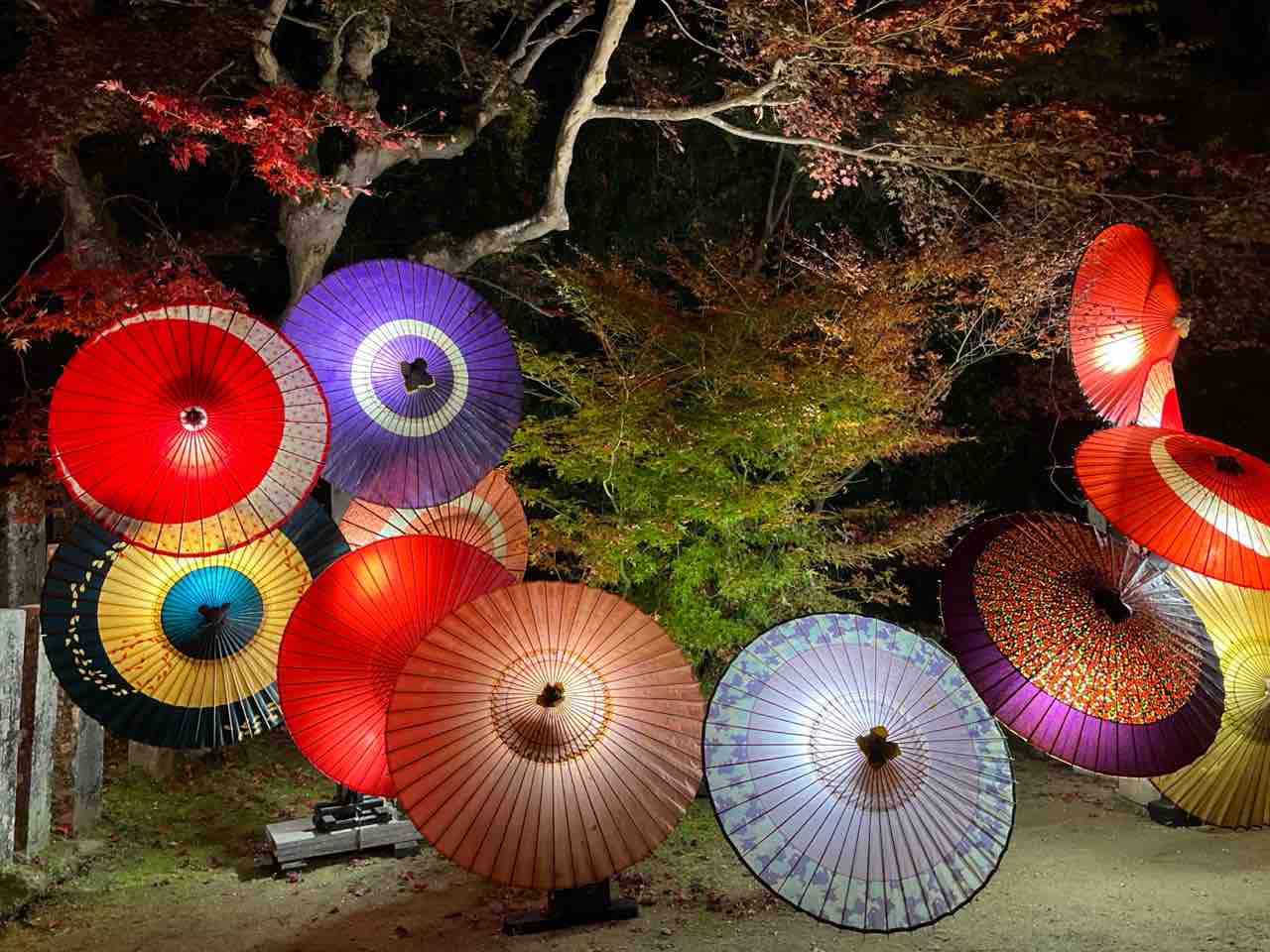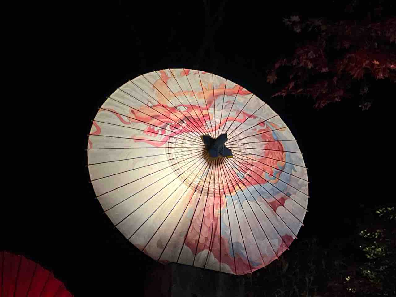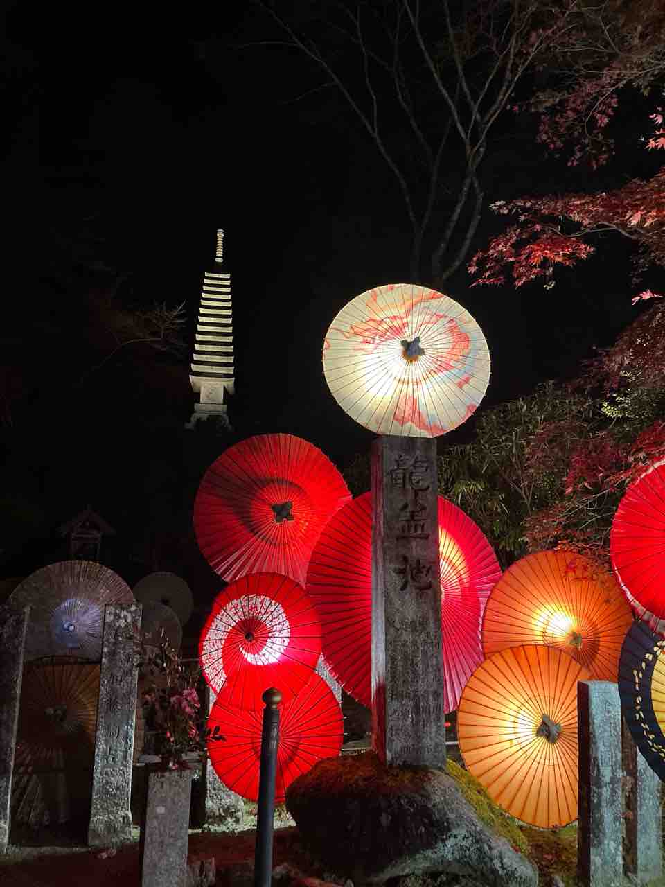 ライトアップされた紅葉と境内のあちこちに飾られた和傘や灯篭が幻想的で綺麗でした。