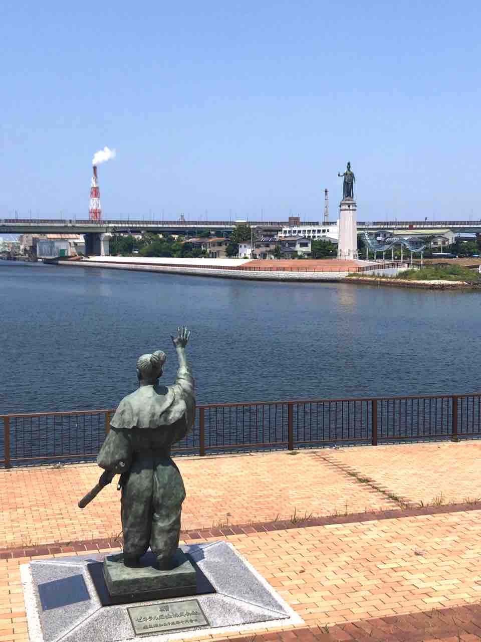 明治36年、この地で開催された博覧会で大浜水族館前に設置されましたが、臨海工業地域開発により撤去された後にまた復元され今に至ります。