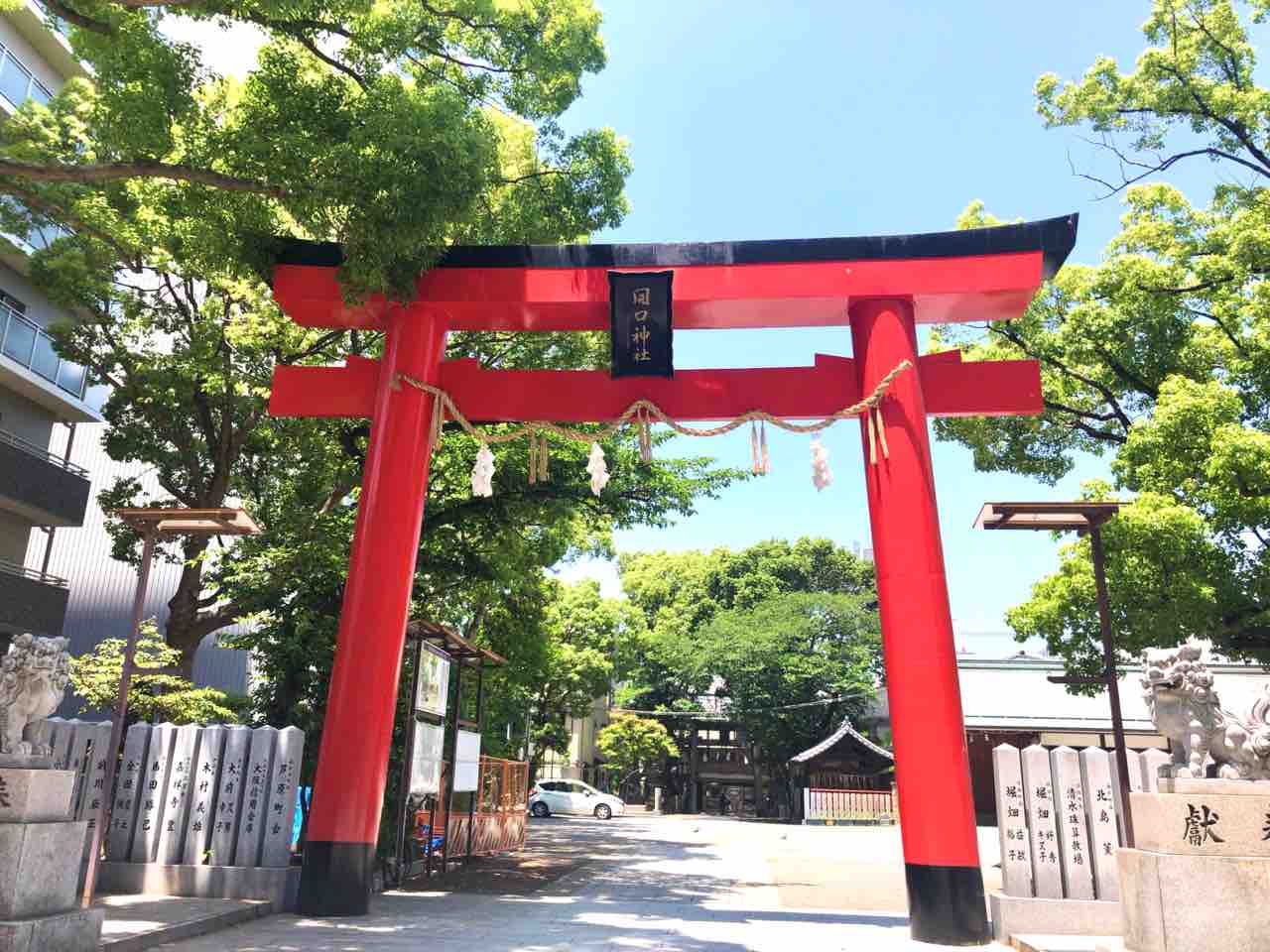 青空に映える朱色の鳥居が玄関口です。山之口商店街側にも鳥居があります。