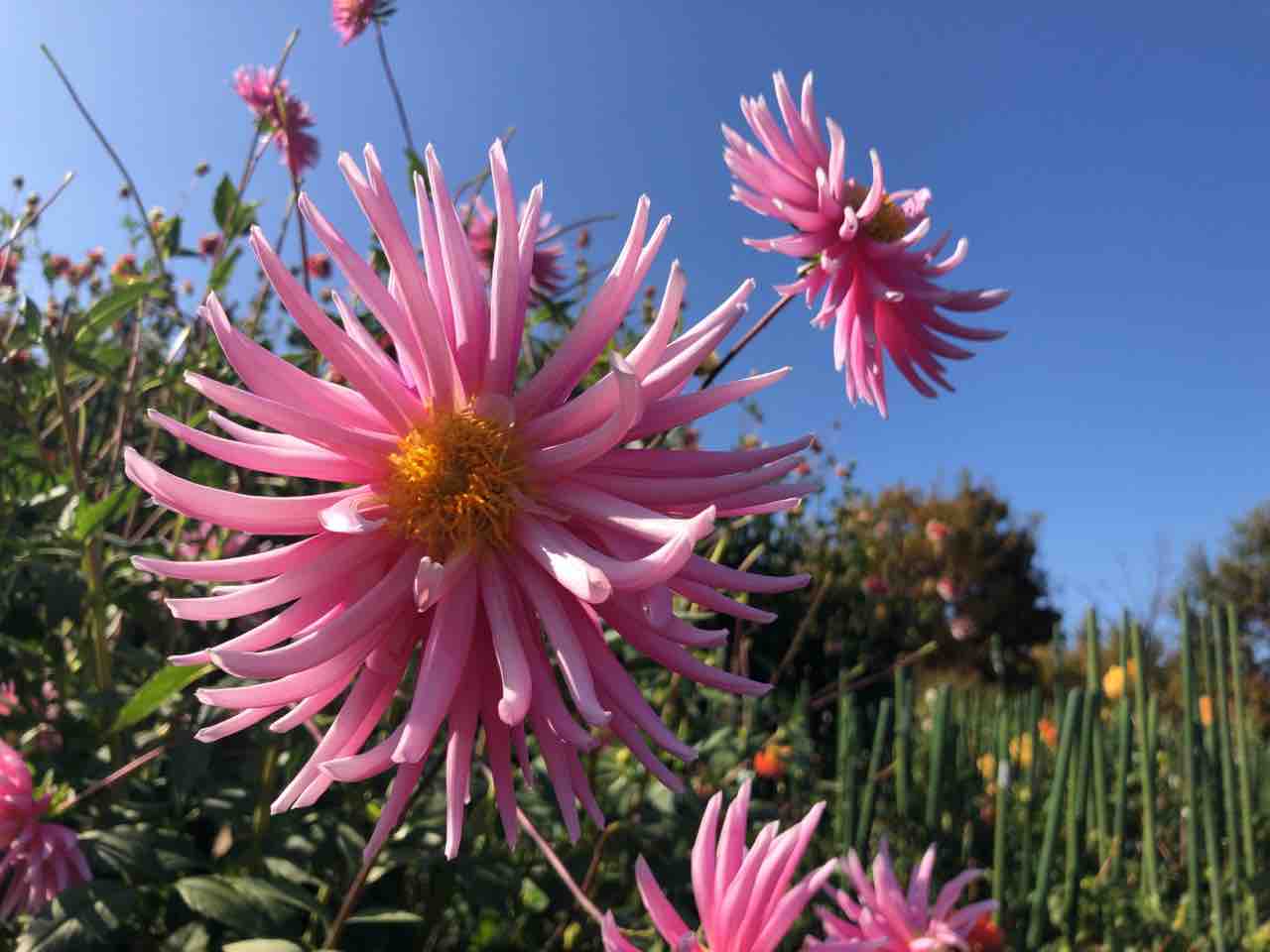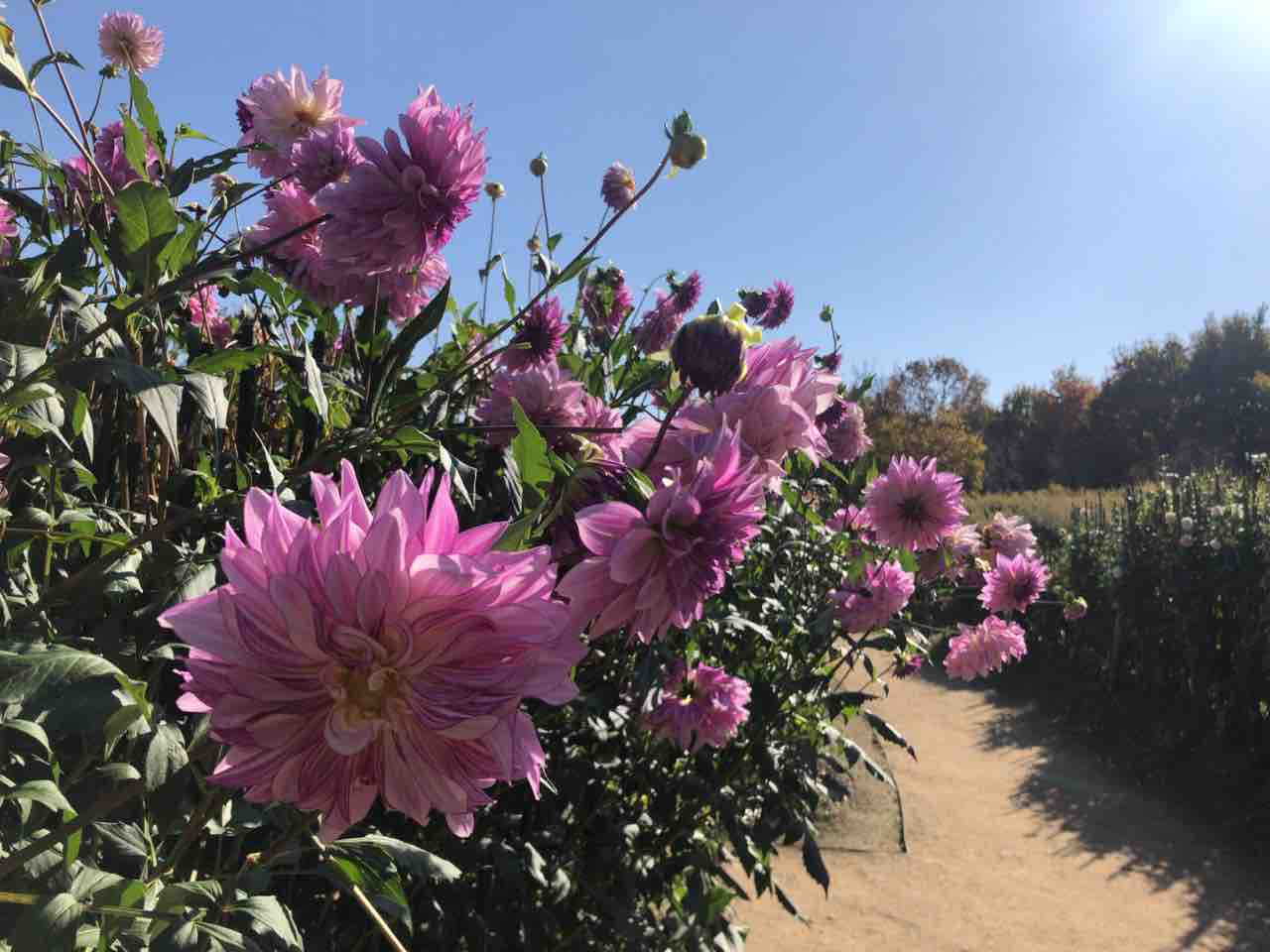 カフェレストランからダリア園が見えるのですが、ちょうど見頃で背の高い大きなダリアが満開でした。