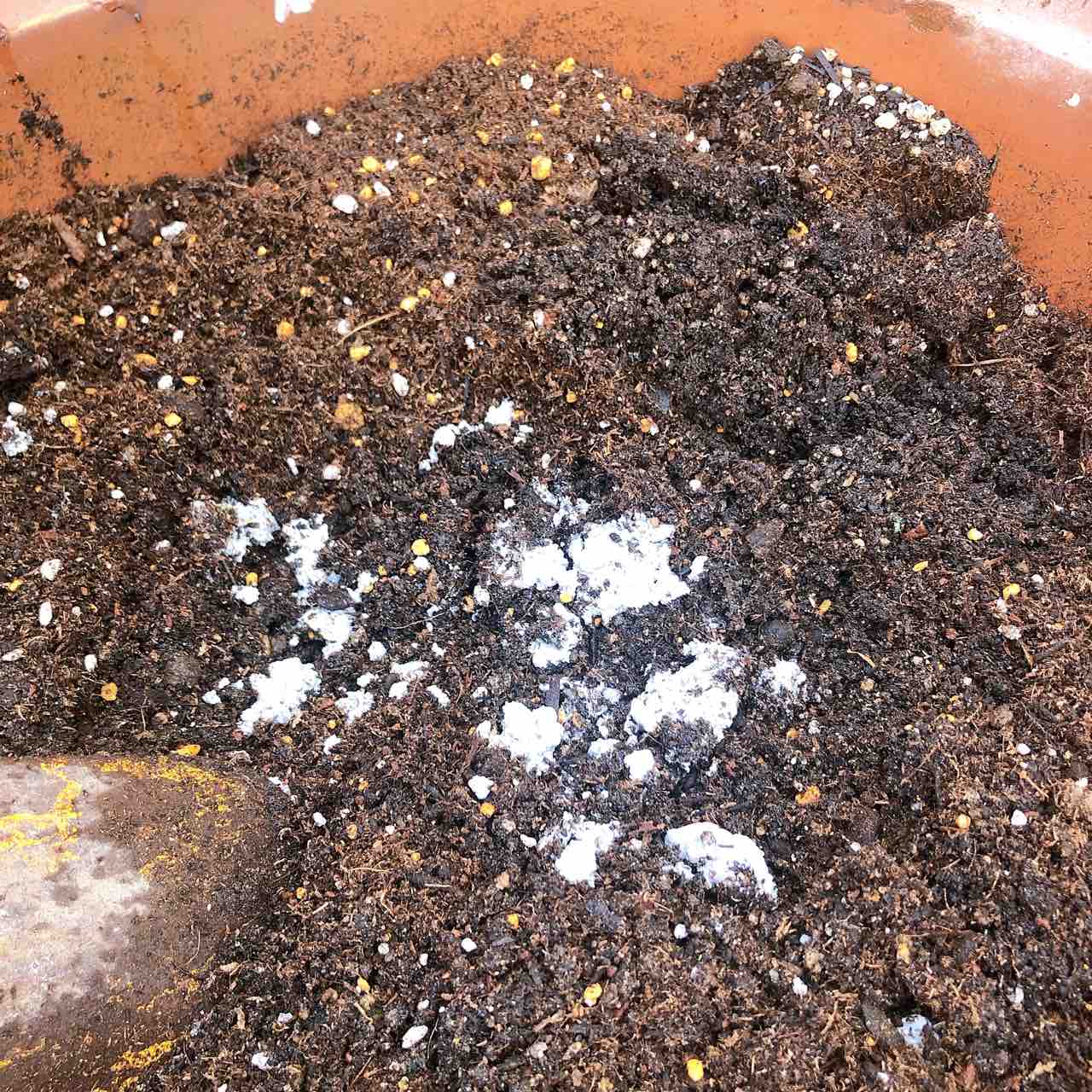 もともと家にあった土と混ぜているところです。この作業をしている間蚊にたくさん噛まれました。もう蚊がいるみたいです。